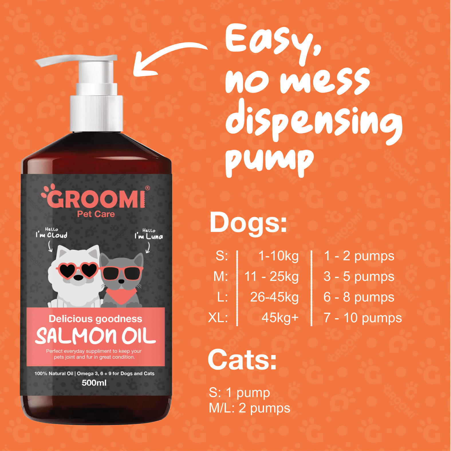 Your pet deserves the finest, so treat them to Groomi Pet Care's premium Scottish Salmon Oil. Made from sustainably sourced salmon, this 100% natural supplement is packed with omega 3, 6, and 9 to improve skin and coat conditions. Plus, it's great for brain activity and joint movement! And don't forget - your pet can't make these essential fatty acids on their own, so make sure to add them to their diet. They'll love the taste and you'll love the health benefits! Just follow our feeding guide and gradually introduce this supplement to your pet's meals. Trust us, they'll be happy and healthy with daily use. Available for dogs and cats of any size. One pump is all it takes (literally)!
